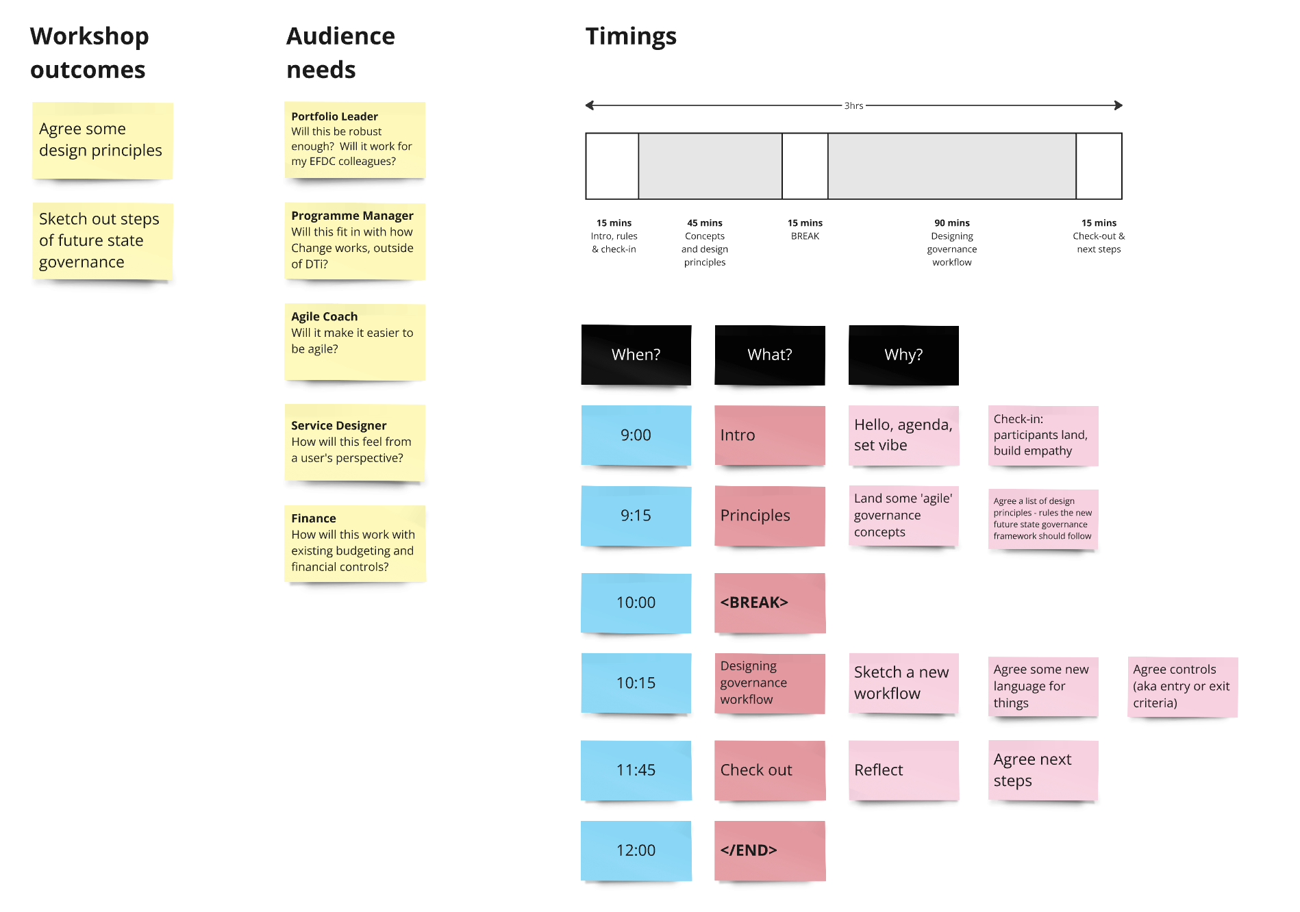 Drawing the timeline is a good way to check the actual workshopping time available, i.e., after factoring in check-ins, breaks, check-outs, and next steps.